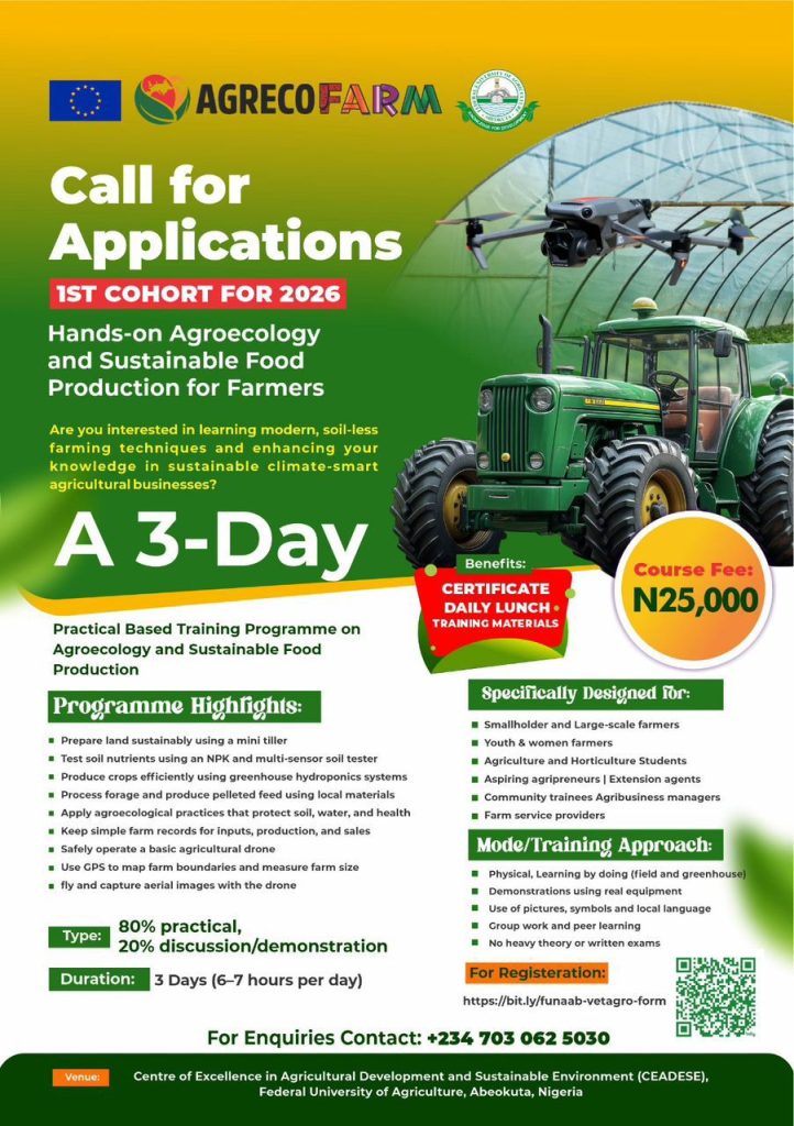 Last Updated on February 25, 2026 by Adewole Oduwole 🎓We are excited to announce a 3-DAY PRACTICAL TRAINING designed to equip farmers and agripreneurs with real, hands-on skills. 🗓 Starting: February 25th-27th 2026⏰ Time: 9:00 AM daily📍 Venue: AGRECOFARM Lab, CEADESE, Federal University of Agriculture (FUNAAB), Abeokuta💰 Course Fee: ₦25,000🎁 Benefits: Certificate + Daily Lunch […]